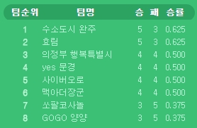 이렇게 8라운드를 치른 결과, 4승3패와 3승4패의 두 그룹으로 나뉘었던 판도는 5승3패 두 팀, 4승4패 네 팀, 3승5패 두 팀의 세 그룹으로 순위가 정렬됐다. 이렇다 해도 어떤 출렁임이 일지 모르는 리그는 여전히 혼돈 그 자체이다. 누구도 1위를 노릴 수 있고, 누구도 8위로 떨어질 수 있다.