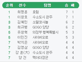 한편 8라운드까지의 개인 다승에서는 이창호 9단과 최명훈 9단이 나란히 7승1패로 공동 선두를 형성 중이다. 그 뒤로 김혜민 9단과 최규병 9단이 6승2패, 유칭혁 9단과 이민진 8단이 5승3패.