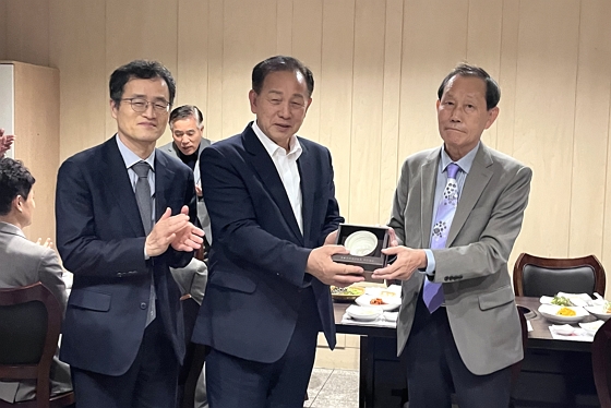 ▲ 양 팀 감독이 신현국 시장에게 선수단의 기념 사인반을 전달했다.