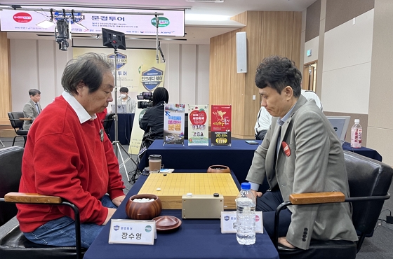 ▲ 상대전적 1승1패에서 17년 만에 마주한 두 기사. 리그 최연장 장수영 9단(73)이 21살 아래인 윤현석 9단을 꺾는 투혼으로 위기의 쏘팔코사놀을 구했다.