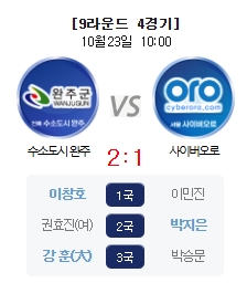 홈에서 전반기의 패배를 갚으며 귀중한 승리를 챙긴 수소도시완주는 8개 팀 중 유일하게 6승째(3패)를 기록하며 단독 선두에 올랐다. 8라운드에서 맥아더 장군에게 일격을 맞은 사이버오로는 연패를 안으며 4승5패.