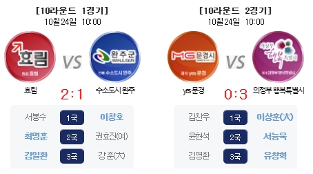 다음 주에는 수요일과 목요일 11라운드와 12라운드와 통합 경기로 진행된다. 11라운드 대진은 예스문경-GOGO양양, 의정부행복특별시-사이버오로, 쏘팔코사놀-수소도시완주, 효림-맥아더장군.