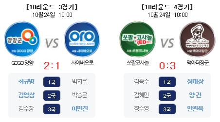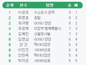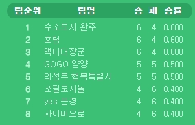 한편 이 밖의 다른 경기에서는 하위권에 처져 있던 GOGO양양이 사이버오로에 4연패의 아픔을 안기며 5승5패, 의정부행복특별시는 전반기에 이긴 예스문경을 다시 3-0으로 완파하는 등 팀 간 희비가 크게 교차했다.